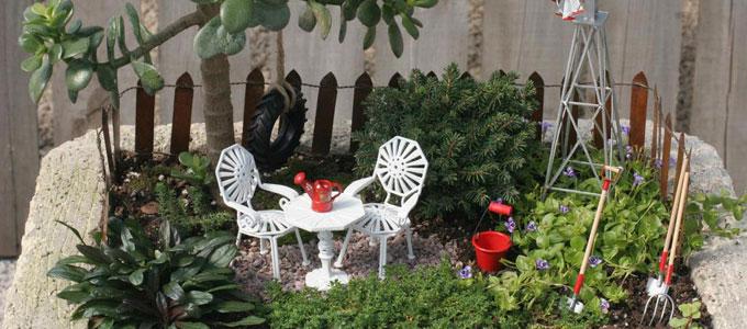 Any vessel that will hold soil and has the capacity to drain excess water will work. Be creative! An average potting soil used for any container will be sufficient. Here’s the truly fun part… planning your garden. Create the garden of your dreams, a whimsical fairy garden or a holiday themed garden. Let your imagination flow. Visit your local craft store for inspiration. Tiny chairs, tables, watering cans, fences, arbors, stepping stones and the like, typically used for dollhouses become your charming garden features.